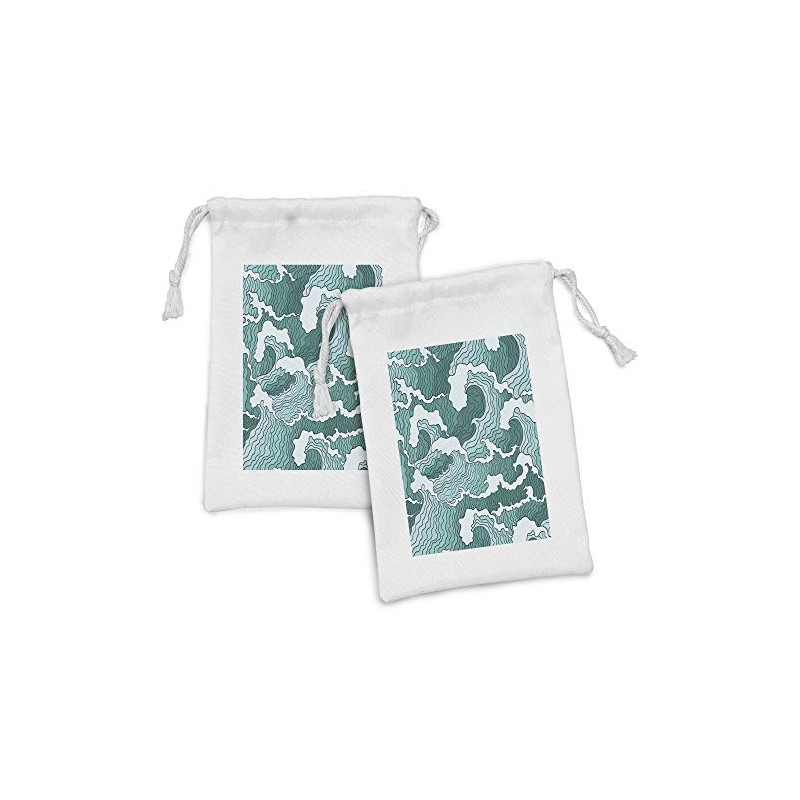 Lunarable Japanese Fabric Pouch Set of 2, Far Eastern Pattern Hand Drawn Style Wavy Lines with Nautical Inspirations, Small Drawstring Bag for Toiletries Masks and Favors, 9" x 6", Turquoise and Teal