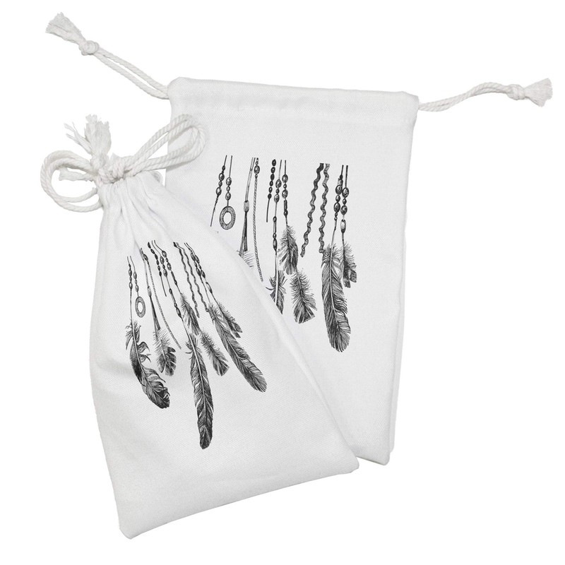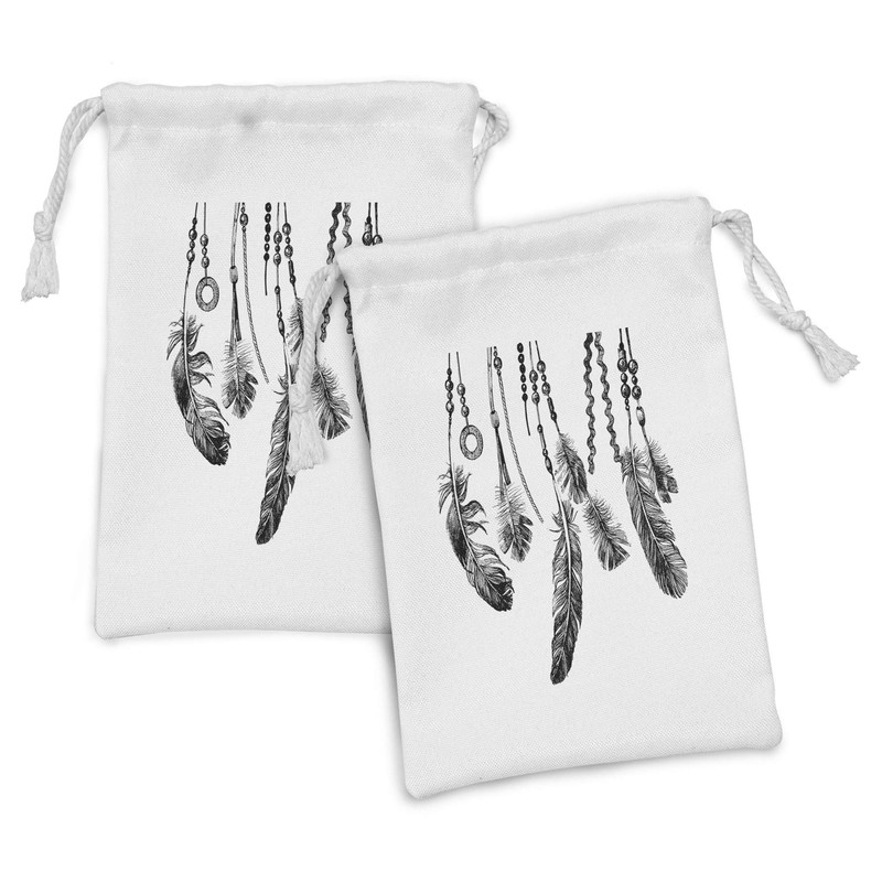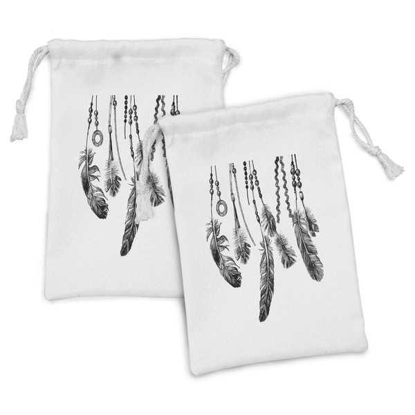 Lunarable Tribal Fabric Pouch Set of 2, Historical Style Feathers Pattern Indigenous Culture Themed Print, Small Drawstring Bag for Toiletries Masks and Favors, 9" x 6", Black White