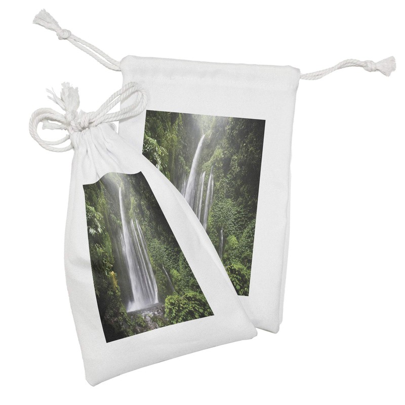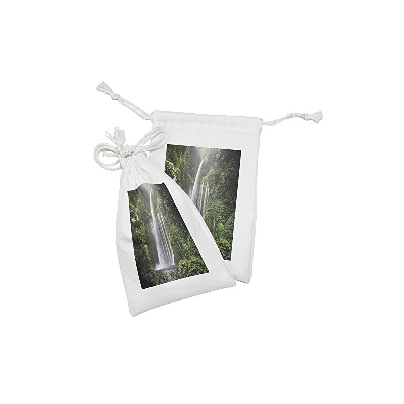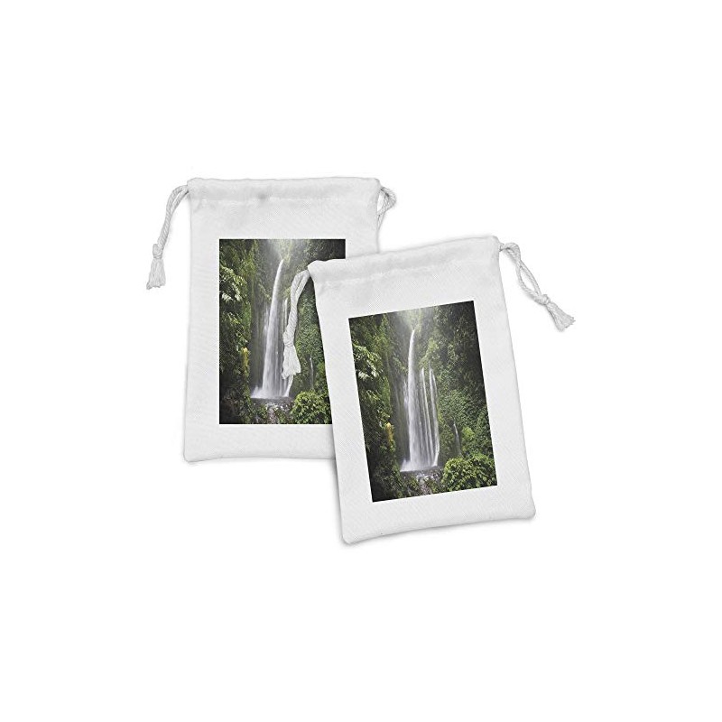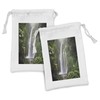 Lunarable Waterfall Fabric Pouch Set of 2, Exotic Rainforest in Indonesia Tropical Trees Adventure Picture Nature Blooms, Small Drawstring Bag for Toiletries Masks and Favors, 9" x 6", Green White