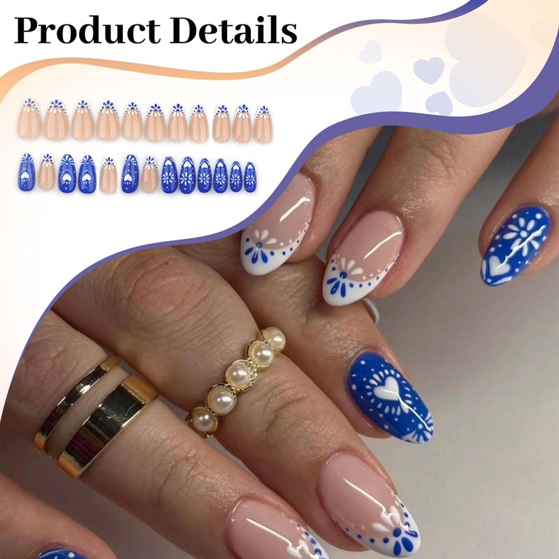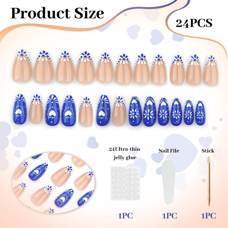 LunarCharm 24 Stück Blau-weiße Totem-Aufdrücknägel, French Tip, künstliche Nägel, kurze mandelförmige Kunstnägel mit Herz-Design, zum Aufkleben der Nägel