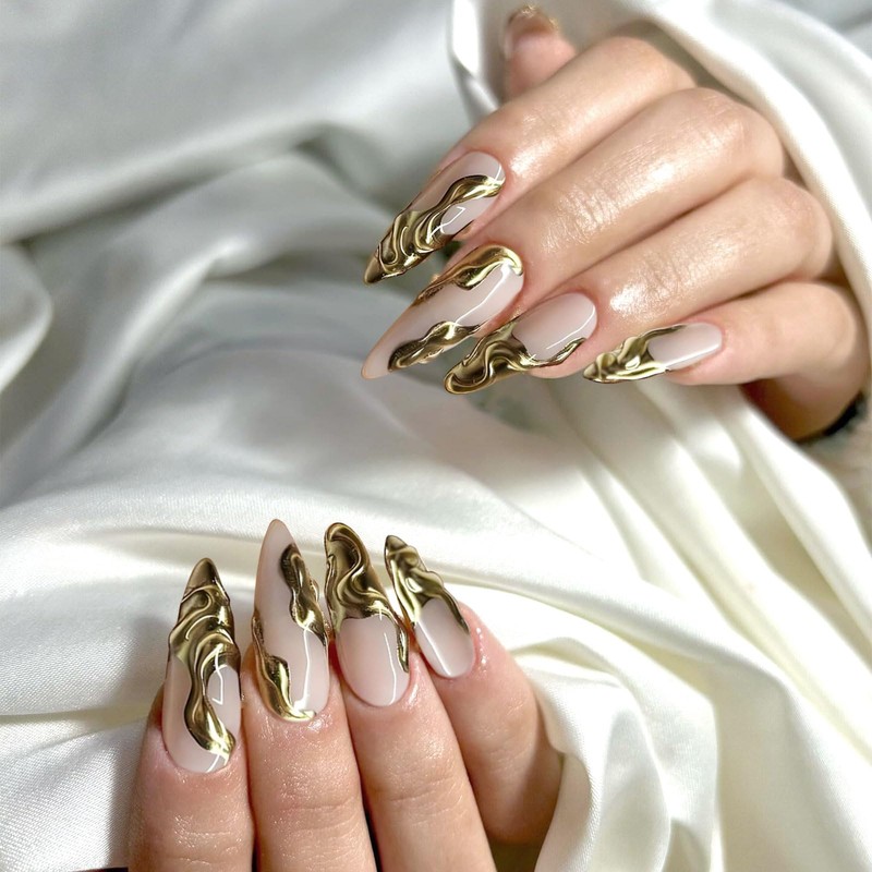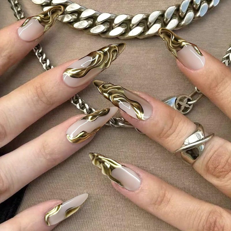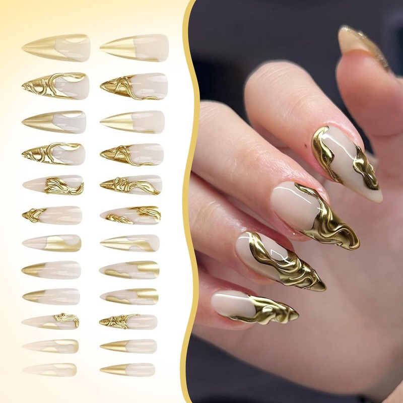 LunarCharm 24 Stück Goldene French Tip Press on Nails Stiletto Fake Nails Nude Künstliche Nägel mit Gold Unregelmäßigkeit Chrom Design Aufklebbare Nägel Glänzende Acrylnägel
