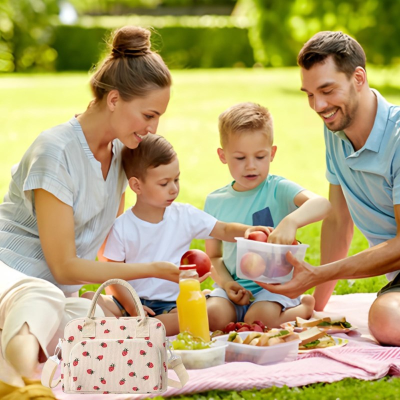 Large capacity corduroy strawberry lunch bag for women men, waterproof and leak proof lunchbag , which can be carried by hand or used as a shoulder bag.