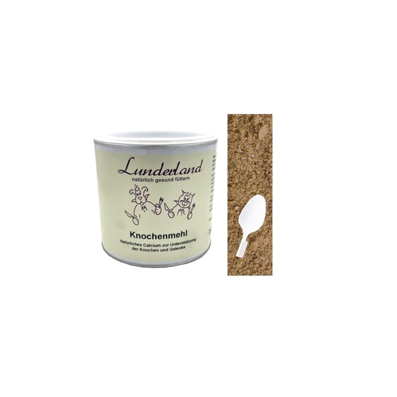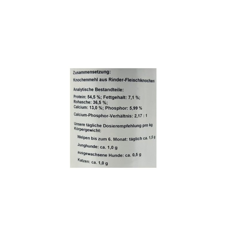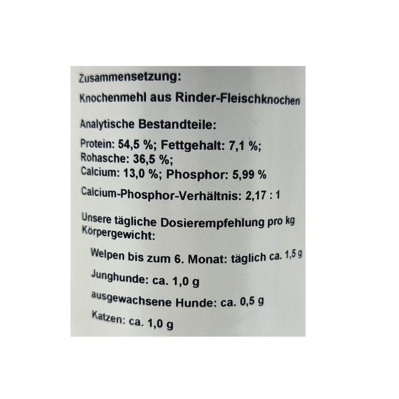 - 100% bone meal from beef meat bone. Supplementary feed for dogs and cats. Includes dosing spoon