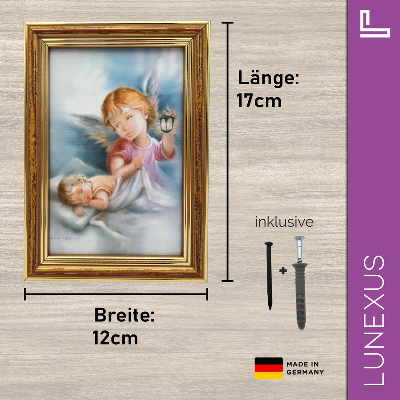 Lunexus Guardian Angel Picture 12 x 17 cm with Wooden Frame and Real Glass - Catholic Blessed - Angel with Lantern Protects Sleeping Baby - Wall Picture Birth Christening Children's Room Religious