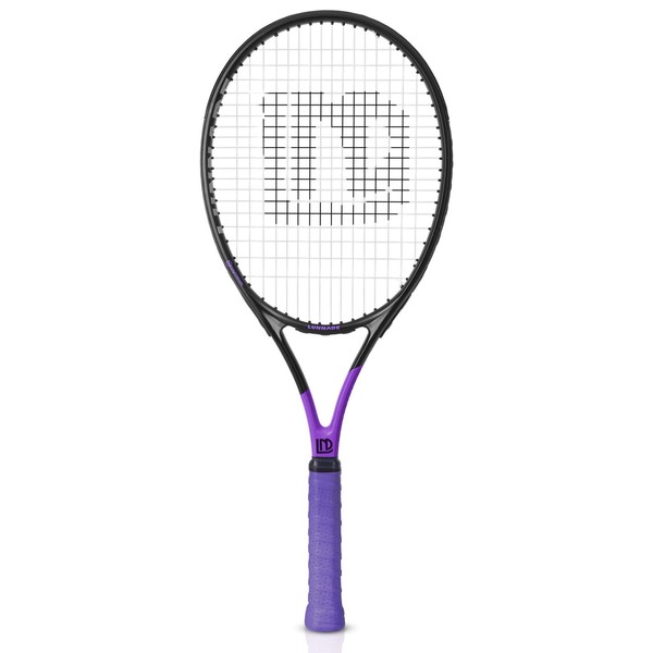 * Comfortable Hand Feeling -- One-piece structure make the tennis racket more stable,the handle is made of pu foaming matrial,soft and shockproof . * Easy to Use -- 102 in² head size and expanded sweet spot,greatly increase the hit rate.the unstrung weight of tennis racket is about 280g ,super lightweight. * Pre-strung and Regrip -- The tennis racket has been threaded by professional stringer andwrapped with shockproof sweatband. * Elegant and Noble Appearance - The main body of this tennis racket is matte black with a few sprinkles ,and the shaft has 4 color options : pink ,purple ,blue and yellow .No matter you are a men or women ,you can choose a best color for you.