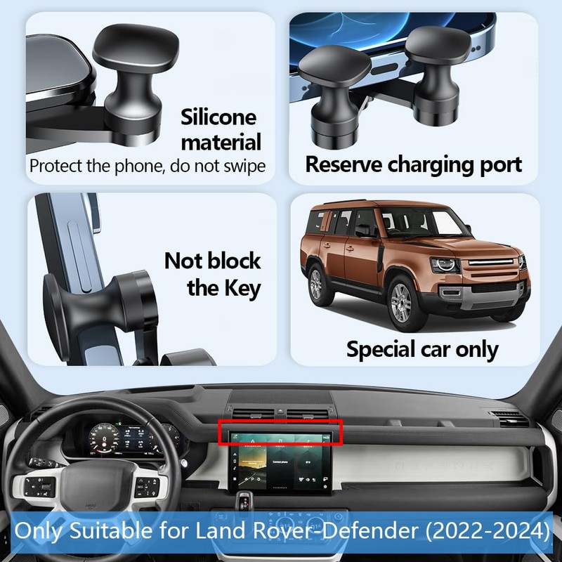 - 👍【Special Mobile Phone Holder】: Only compatible with Land Rover Defender 2022 -2025,(Not Fit 2020 and 2021 Defender)SPECIAL CAR BASE DESIGN, only for a specific model development. Please confirm the model and year of your car before placing the order. Or contact us and send a picture of the central control of your car, and we will help you pick the one.