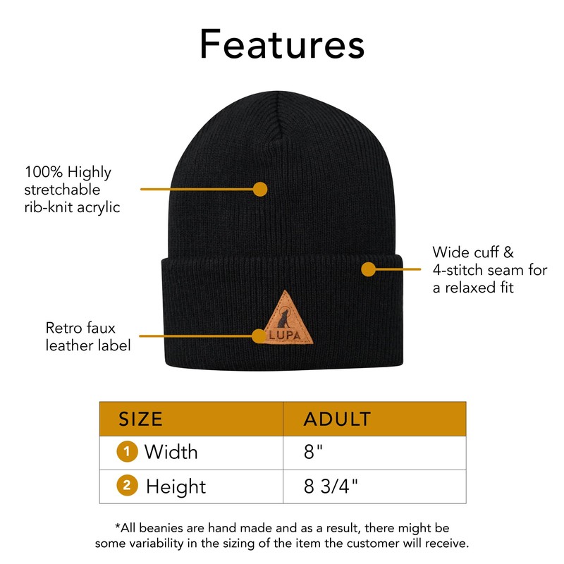 - LUPA ACRYLIC RETRO TUQUE: An extremely warm and comfortable men's and women's beanie made with thick rib-knit acrylic. Featuring a retro faux leather triangular design with a wide cuff and 4-stitch seam for a relaxed fit. This classic tuque is wind-resistant, never itchy, and made to fit just right.
