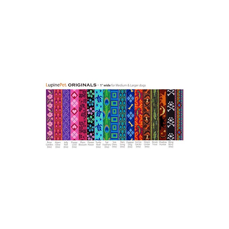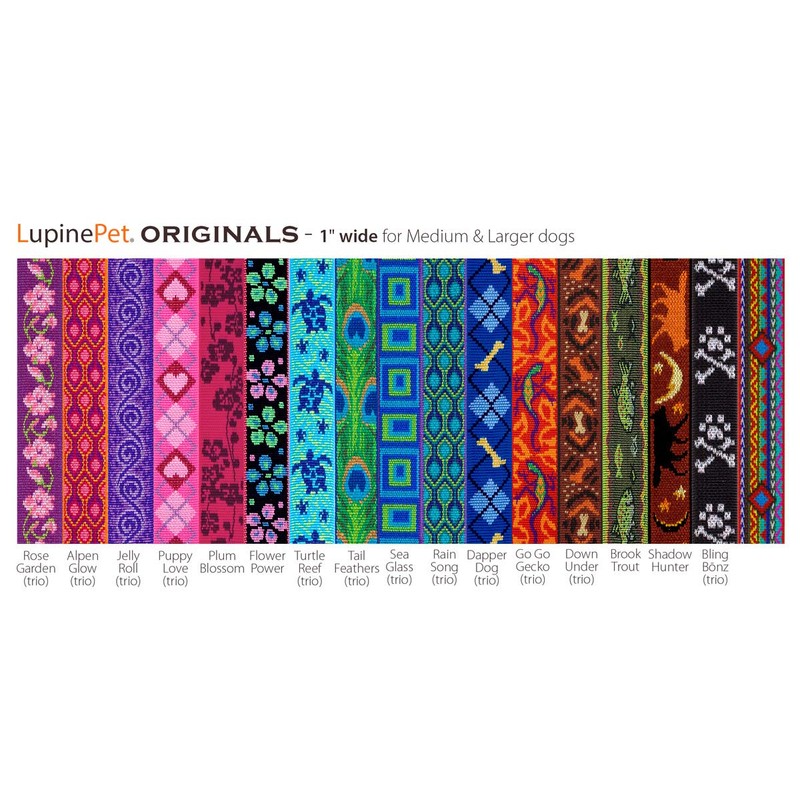 Lupine Originals are made from woven nylon in an array of colorful designs. The pattern is woven into the webbing, rather than printed or sewn on. Made with strong bar-tack stitching, welded steel hardware, and ends are turned under and stitched to protect fur and skin.