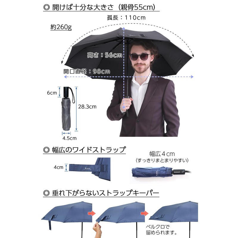 • Ribs Length: 21.7 inches (55 cm), Arc Length (Fabric Radius): 43.3 inches (110 cm), Opening Diameter: 38.6 inches (98 cm), Weight: Approx. 9.8 oz (280 g) (may vary depending on individual differences, dryness, and color types. Number of ribs: 8 pieces; Length when unfolded handle: 22.0 inches (56 cm); Length when folded: 11.2 inches (28.3 cm); Opening method: one-touch button (automatic opening/closing); Folding method: Tri-Fold; Material: Polyester, Carbon fiber, lightweight aluminum, high rigidity steel, ABS resin; 1.6 inches (4 cm) wide strap, strap keeper