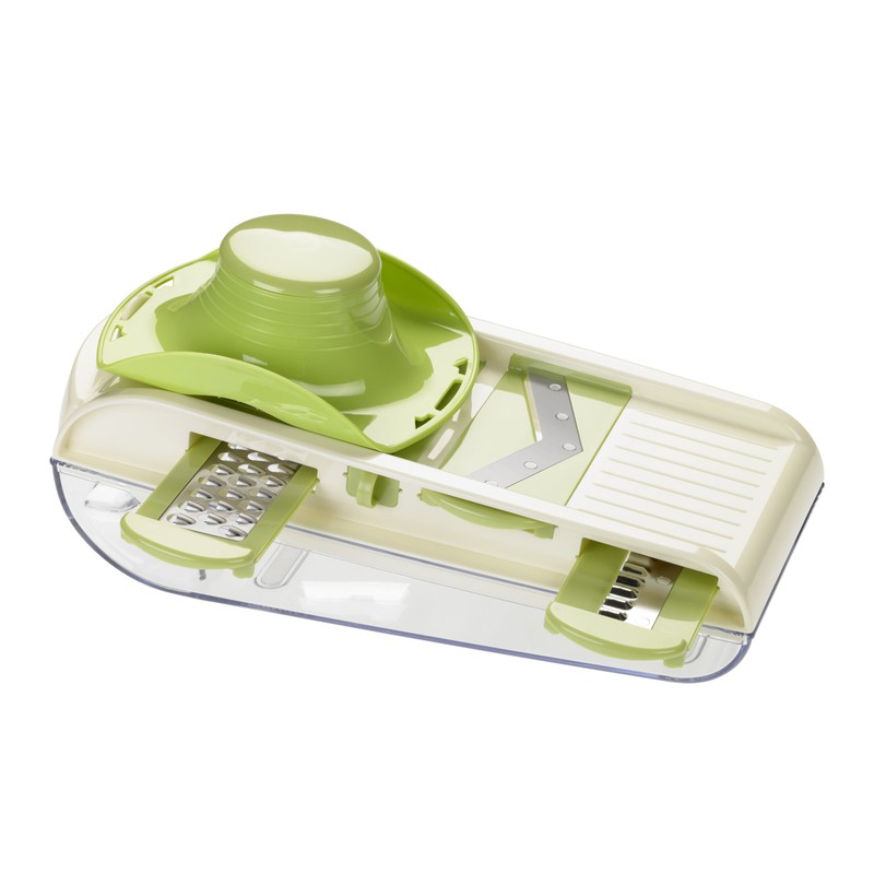 • With four interchangeable stainless steel blades: Julienne grater, Grobraspel, shaft diameter and planning