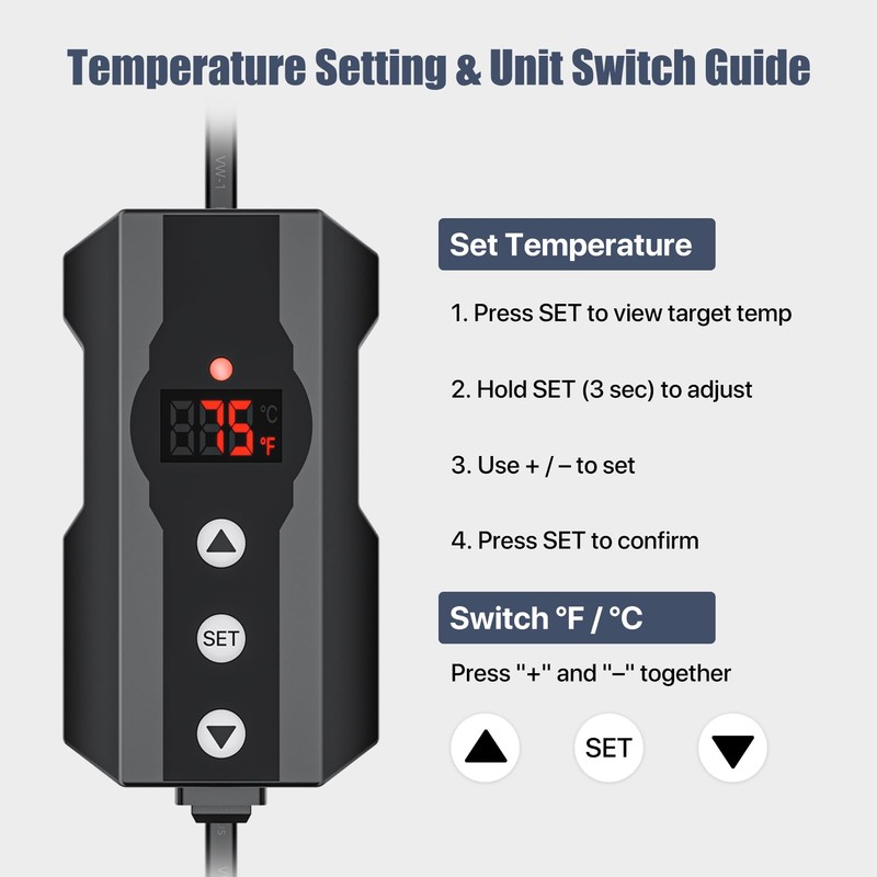 - ๐๐ญ๐๐๐ฅ๐ ๐๐๐๐ญ๐ข๐ง๐ ๐ฐ๐ข๐ญ๐ก ๐๐ฆ๐๐ซ๐ญ ๐๐๐ ๐๐จ๐ง๐ญ๐ซ๐จ๐ฅ: Advanced PID technology ensures precise, stable heating without harsh on/off cycles. Perfect for reptiles, amphibians, and aquatic pets needing consistent warmth.
