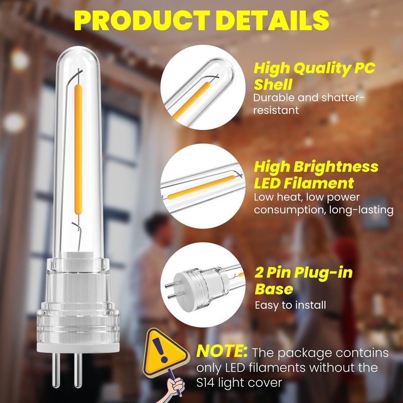 - Direct S14 Replacement: Get 6 LED Filament Bulbs (no S14 pear-shaped covers included) in one pack, perfect for directly replacing original S14 bulbs for outdoor string lights. Please confirm your string light bulb have 2-prong socket before purchasing