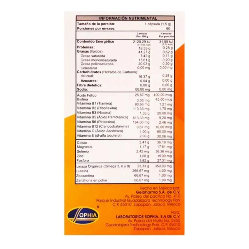 - Ingredientes: 6 y 9, Alimentos deshidratados, Extractos vegetales, Hierbas y concentrados de frutas., Minerales, Omega 3, Vitaminas, Zeaxantina y luteína.