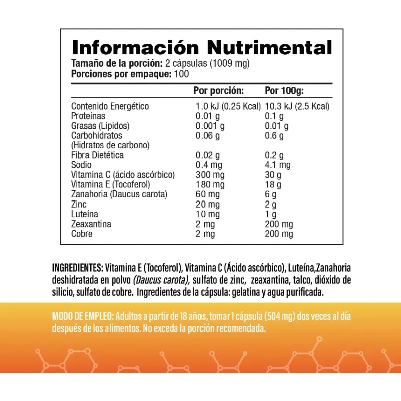 Lutena y Zeaxantina - Complejo con Vitaminas C y E, Zinc, Cobre y Zanahoria - 200 Cpsulas - SV - Suplemento que ayuda a mantener la Salud Visual