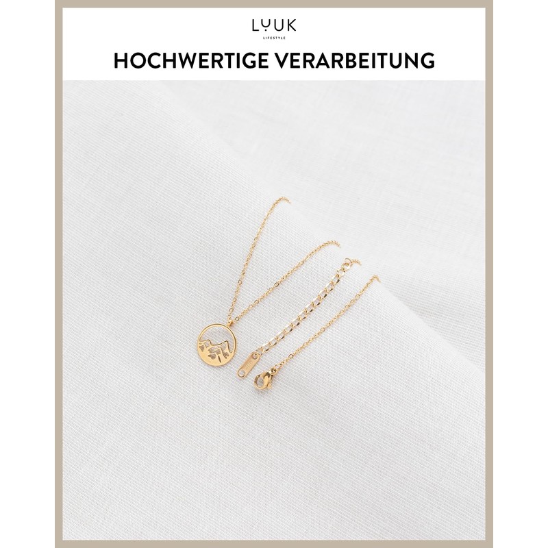 LUUK LIFESTYLE Filigrane Halskette mit Berggipfel Plättchen Anhänger und Happiness Spruchkarte, wasserfester Edelstahl, moderner Damenschmuck, Geschenk für die Freundin, Gold