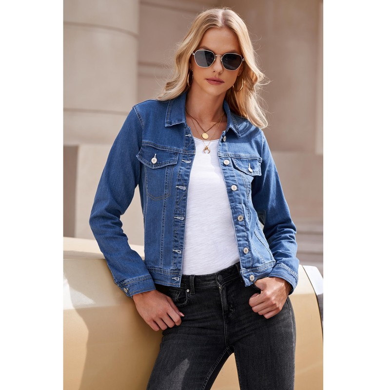 luvamia Women's Casual Basic Button Down Stretch Regular Fit Long Sleeves Denim Jean Jacket Nightfall Blue Size Small
