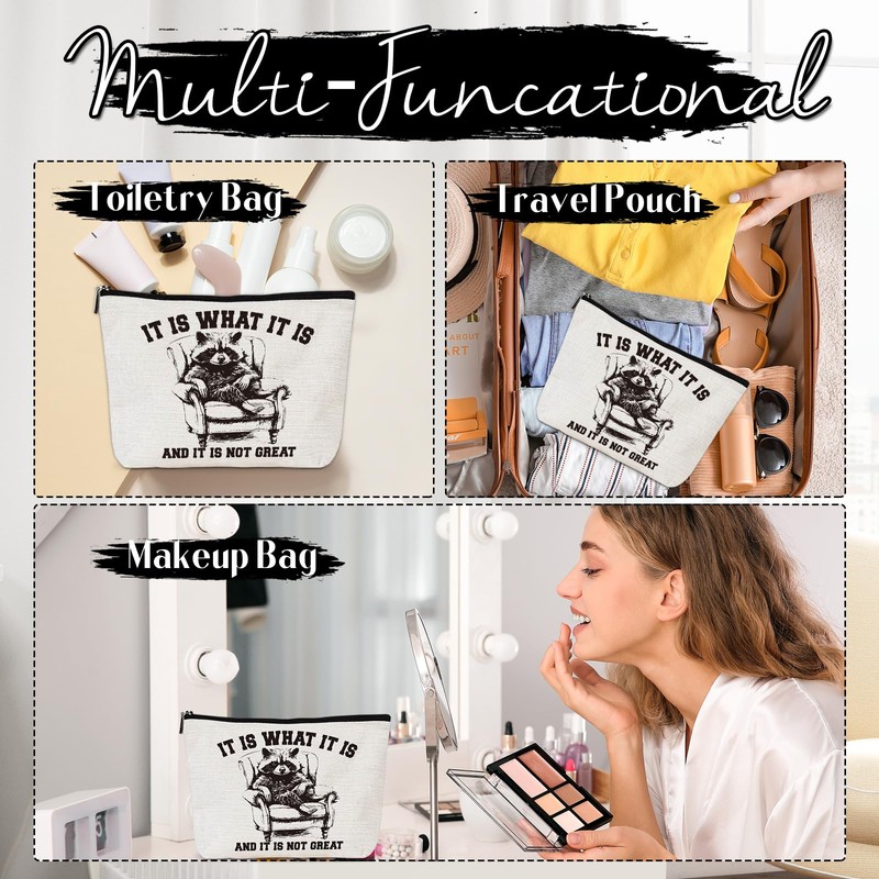 - Funny Raccoon Design: This funny raccoon makeup bag features the humorous phrase “It is what it is and it is not great,” paired with a cool raccoon illustration. Its playful, satirical design makes it a funny gift for friends, familes, raccoon lovers, or anyone with a sense of humor who loves witty sayings