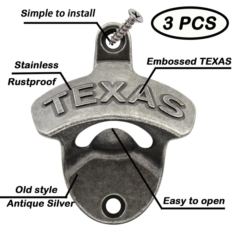 • Material and finish: The screw on wall beer bottle cap opener with embossed "TEXAS" is made of stainless zinc alloy, rustproof