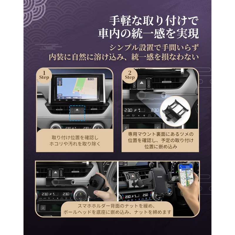 【手軽な取り付けで車内の統一感を実現】 LUWUのRAV4 10系/15系 延長アームスマホホルダーは、RAV4 10系/15系専用にデザインされており、インテリアに完璧にフィットします。特別な工具や複雑な手順は必要なく、[安装方法]だけで取り付け完成。専用設計により、車内のインテリアと調和し、統一感を演出します。これにより、クリーンでスタイリッシュな空間を保ちながら、機能性も確保。快適なドライブをサポートします。