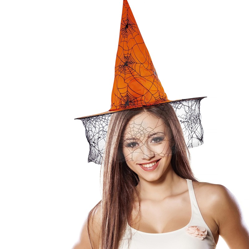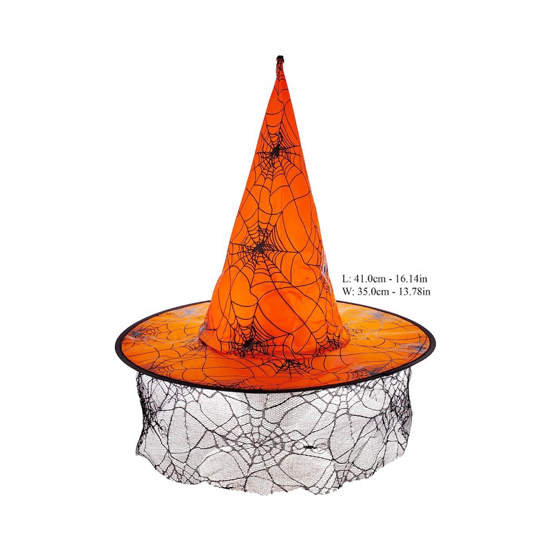 LUX ACCESSORIES Orange with Black Spiders & Webs Witch's Hat and Black Spider Web Veil accent Adult Size Halloween Costume