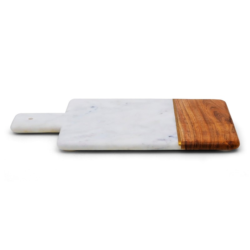 Our 12-inch Marble and Wood Cheese Board is not only designed to be a serving tray for cheese, charcuterie, fruits, or snacks. You can also use it as a fully functional cutting board for the kitchen or a large coaster for pitchers, pans, pots, and more.