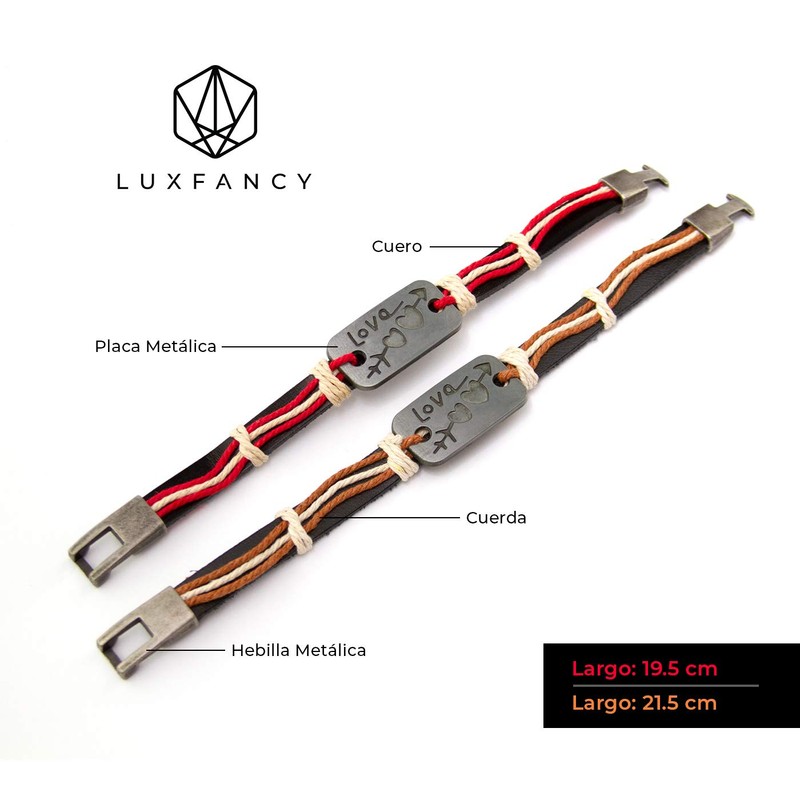 - 💑MATERIAL: Pulseras de CUERO para pareja, cuenta con placa metálica con la palabra LOVE y dos corazones, detalles en cuerda color rojo y café y una hebilla metálica.