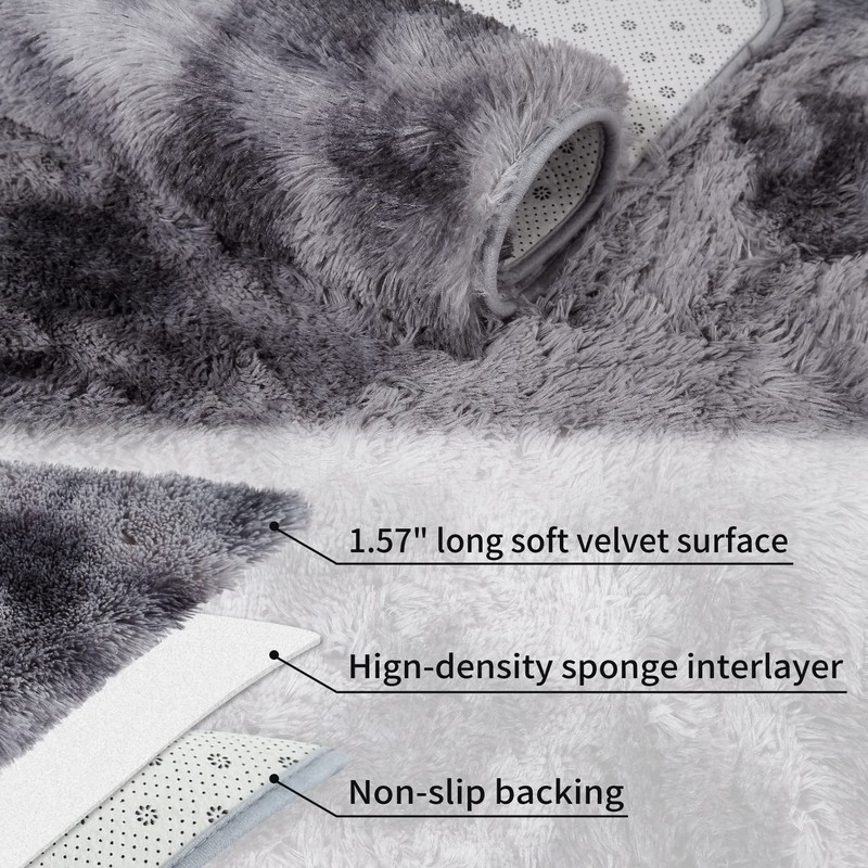 - Premium Material: Our area rug was designed to last for years to come! This extremely soft fluffy rug is made of 3 layers of high quality material. The shag rug surface is covered with 1.6" velvet faux plush high pile for warmth and beauty. The fuzzy rug also features an ultra-soft foam middle layer and a non-slip base. 400 GSM high-density shag carpet surface(total about 650GSM with bottom), our area rug is incredibly soft and comfortable.