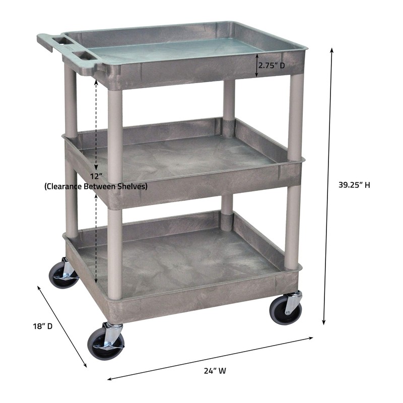 - SPACIOUS: Cart measures 24 in. W x 18 in. D x 39.25 in. H; tub depth is 2.75 in.; clearance between shelves is 12 in.