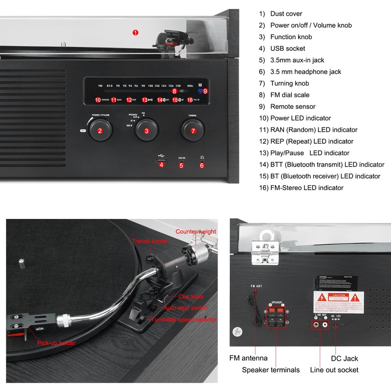 - Built-in Bluetooth receiver and transmitter, USB playback & encoding, FM Radio, 3.5mm headphone jack, AUX-in and Line out connection. .