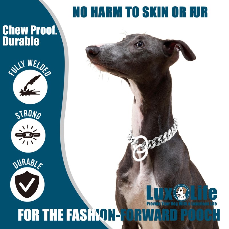 - Elegant Design for Every Moment: Featuring a classic Cuban link pattern and a sleek Gold finish, this collar is a stylish statement piece for your pet. Designed to complement all breeds and sizes, it effortlessly elevates your dog’s look, whether for everyday strolls, training sessions, or special occasions.