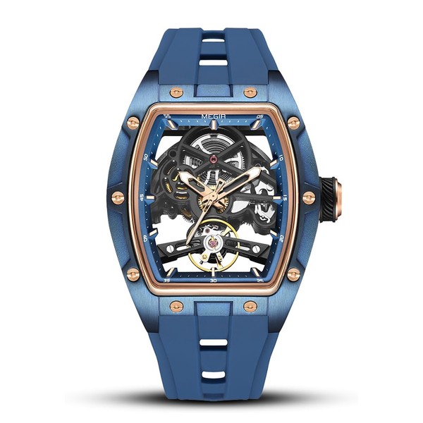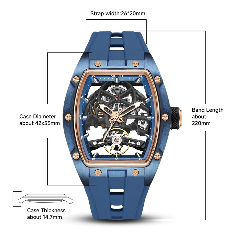 Luxury Automatic Mechanical Skeleton Watch, 42x53mm Alloy Case, Luminescent Hands, Silicone Strap, 3ATM Water Resistant, Blue