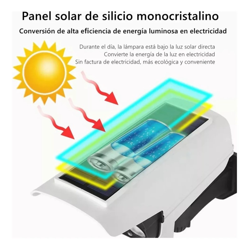 No es una cámara, sólo una luz solar. Diseño de cámara de pistola simulada, para que los ladrones no se atrevan a acercarse. Elemento de detección doble mejorado, distancia de detección rápida de 3-5m. Cuando trabaja de noche, tiene una función de detección de movimiento, cuando detecta movimiento, las luces blancas y rojas se encenderán.