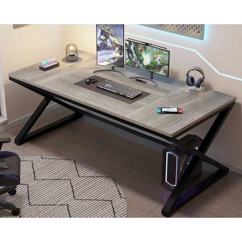 - 【Spacious Work Area】: This large industrial Light Grey desk, measuring 70.8 inches long and 31.49 inches deep, the large deep desk offers a spacious work area that easily accommodates 2 monitors, books, documents, laptops, lamps, and other work equipment. This long work desk with open storage space design allows your legs to stretch freely without any obstacles, there's a metal tube underneath to give your feet a rest, making it ideal for office tasks, studying, writing, or gaming, enhancing both efficiency and comfort