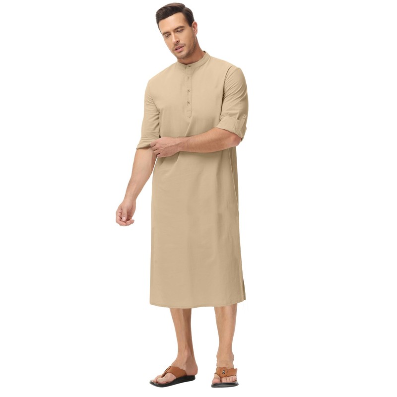 - Timeless & Functional Design: Featuring a classic Henry collar and buttoned roll-up sleeves, this thobe blends traditional style with modern details, offering both elegance and practicality.