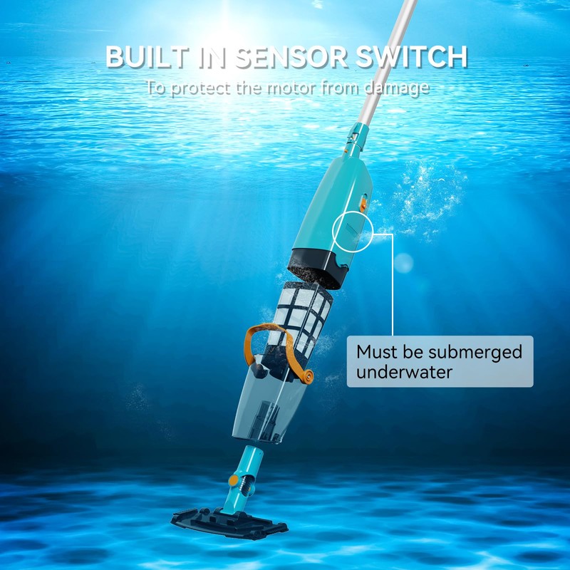 • 🔹【Auto Shut-Off & Warranty Support】Automatically powers off after 60 seconds out of water to protect the motor. Backed by a 12-month limited warranty and responsive customer support. Package includes vacuum, charger, manual, and telescopic pole.