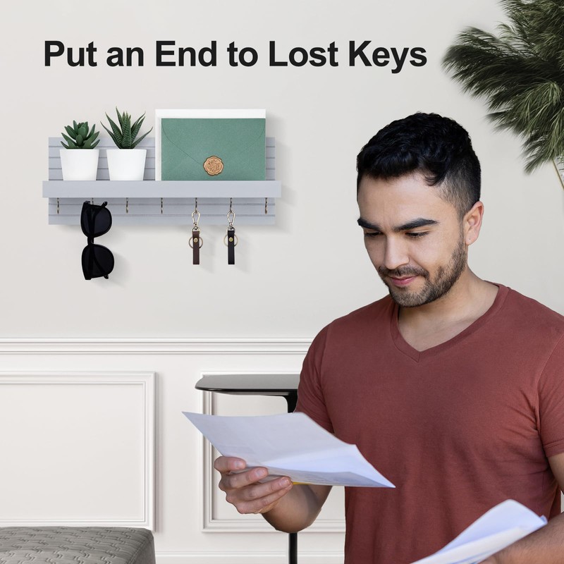 The contemporary grooved design etched into the substantial, genuine pine wood creates an enticing and robust key holder with shelf for your front door.The baffle design prevent items slip out of place. Quality wooden board and sturdy mental hooks can holder items well won’t bend easily. The keyhole brackets on the back of the decorative key holder enable flush installation on walls, ensuring neat and tidy look. This versatile mail holder and key rack with shelf centralizes the organization and storage of frequently accessed items such as sunglasses or mails, providing organize solution for everyday essentials.