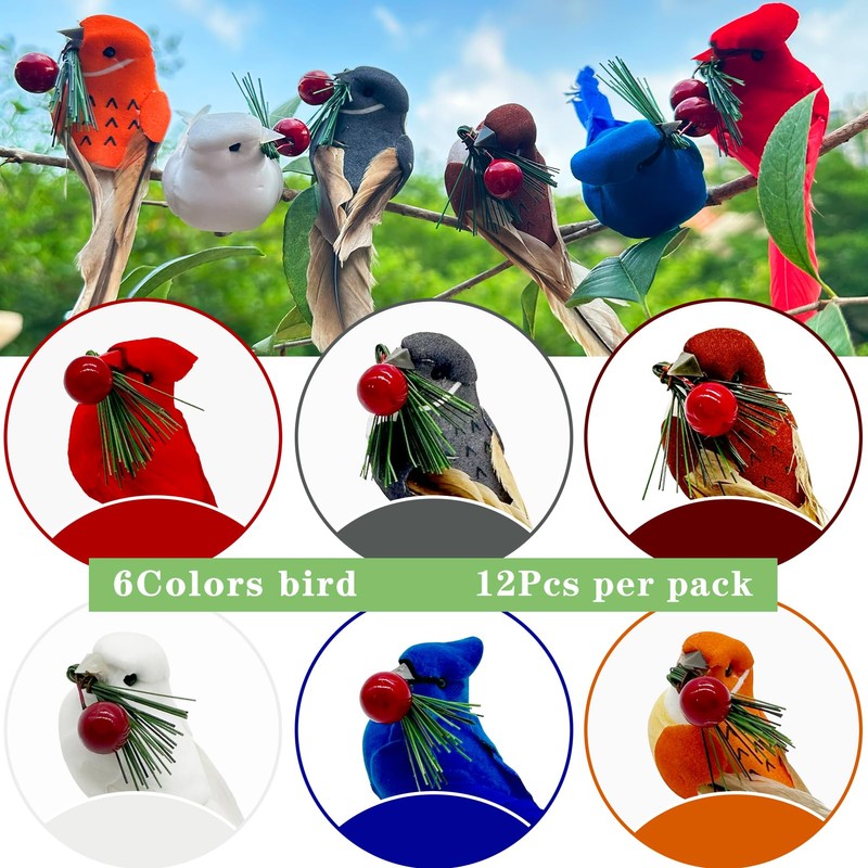 LWINGFLYER 12 PCS Artificial Birds Clip Ornaments Feathered Birds with Red Berries for Christmas Tree Decoration Crafts Jungle Garden Home Decor
