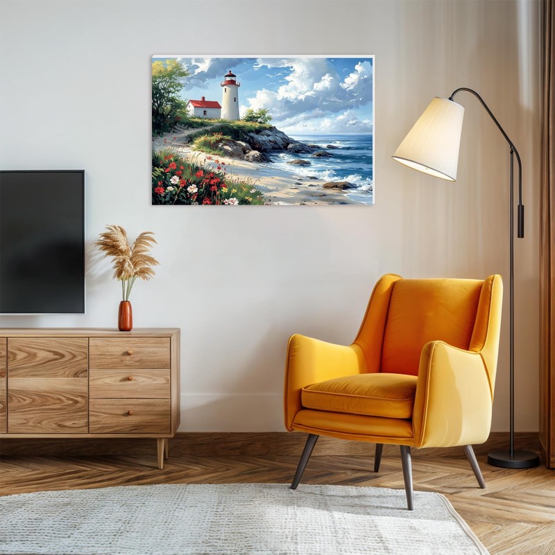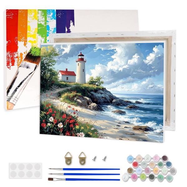 Lxmsja Sea Lighthouse Paint by Numbers Kit for Adults, Acrylic Beach Rocks Paint by Numbers for Adults Beginner, DIY Craft Supplies Oil Painting Kits for Home Wall Decor 16x12 inch (Framed)