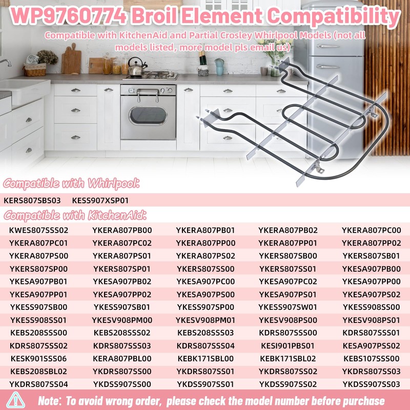 • 【Wide Compatibility – Perfect Fit for Major Brands】This WP9760774 oven broil element fits Cros-ley, Kitc-henAid, and Whirlp-ool Range/Stove/Oven/Microwave, and microwave combos. Whether you need a WP9760774 oven heating element or a replacement broil part, verify your model number or contact us for assistance. A versatile solution to restore your appliance’s baking function efficiently.