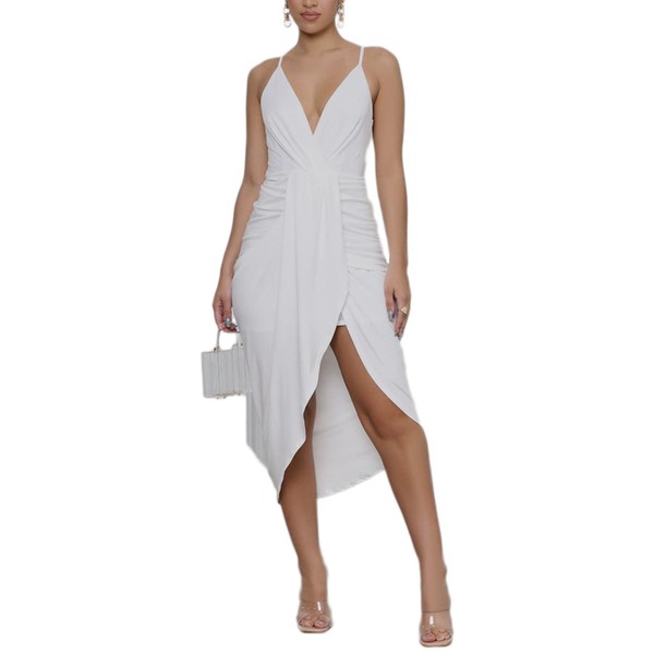 LYANER Women's V Neck Ruched Wrap Slit Hem Sleeveless Spaghetti Strap Midi Bodycon Dress White Medium