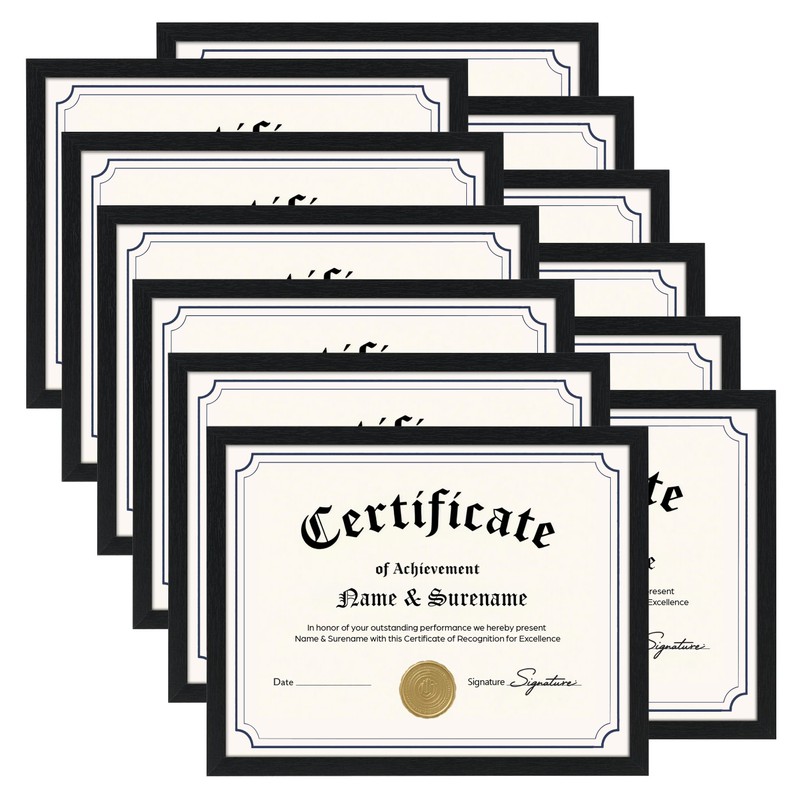 Showcase diplomas, awards, A4/Letter documents, or cherished photos effortlessly with this essential 12-pack of 8.5" x 11" frames. The perfect graduation gift, each frame securely displays standard certificates without trimming. Designed for safety and peace of mind, the lightweight construction and shatterproof PS glass protect against impacts and eliminate dangerous shards, ideal for homes with kids or pets.