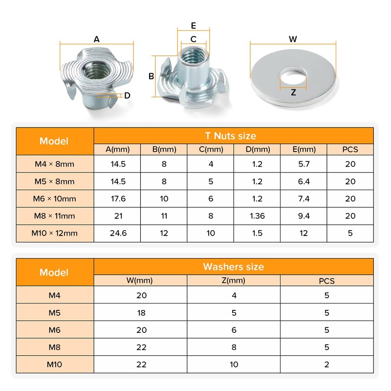 - Package includes: 85 pieces T-nuts in sizes M4, M5, M6, M8, M10 and 22 pieces washers.
