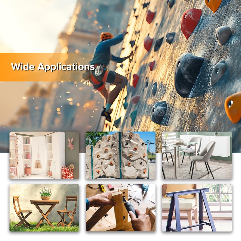 - Wide Applications Suitable for solid wood products, plywood, particle board to meet a very strong connection function. Commonly used in fixed cabinets, table and chair legs, leather bags, climbing wall installations, etc.