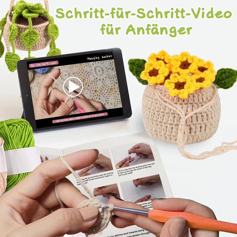 - Crochet beginner set: the crochet hook set contains everything you need to make charming plants, including beginner-friendly instructions and videos, sufficient 6-colour yarn, filling, eyes, ergonomic crochet hook, yarn needle and sewing thread marking. Complete crochet kit so you can start your crochet journey anytime and anywhere.
