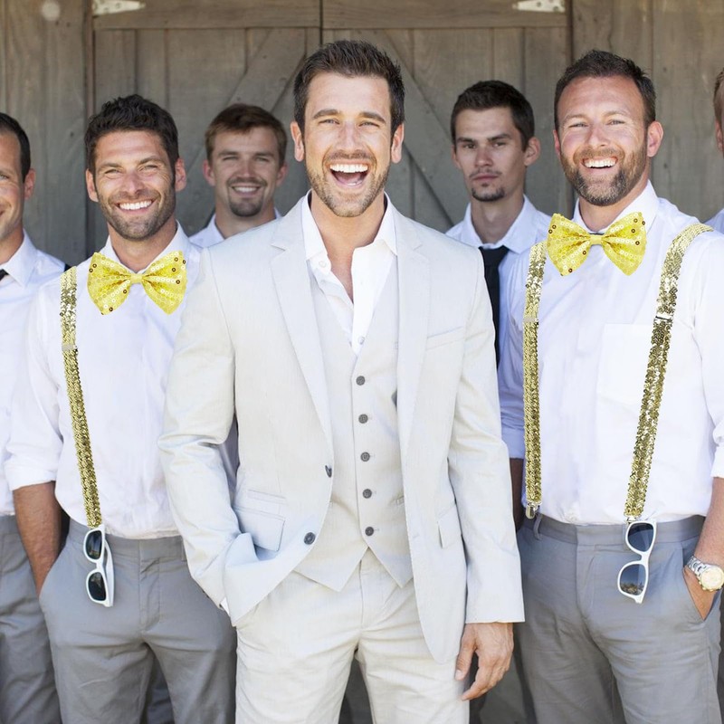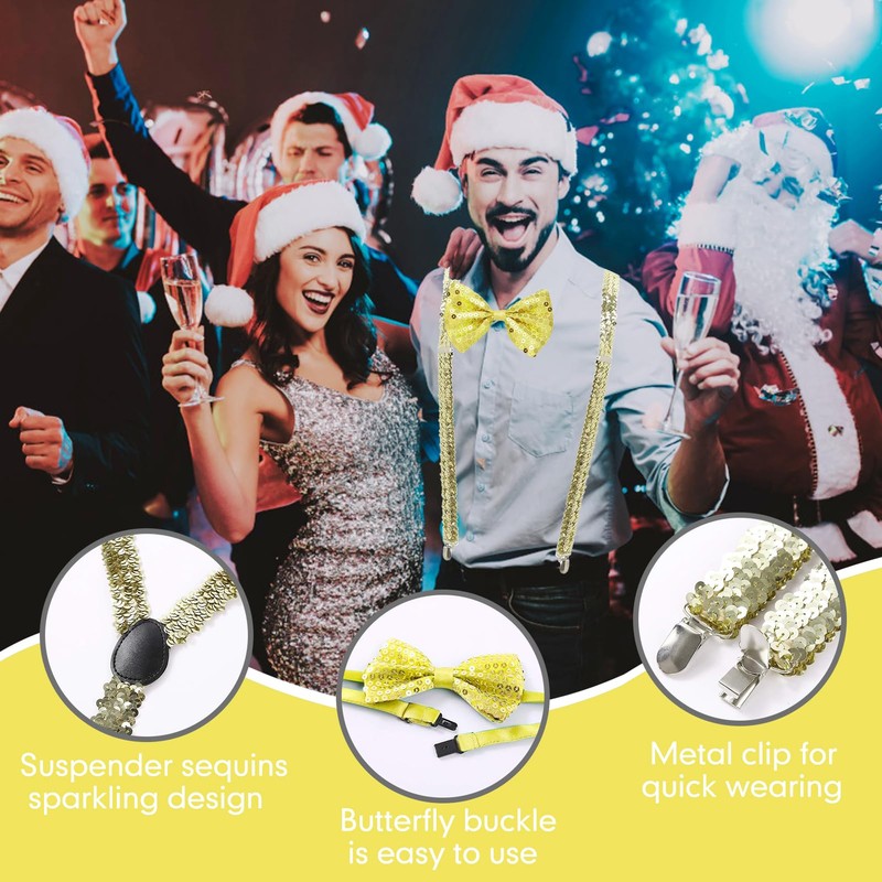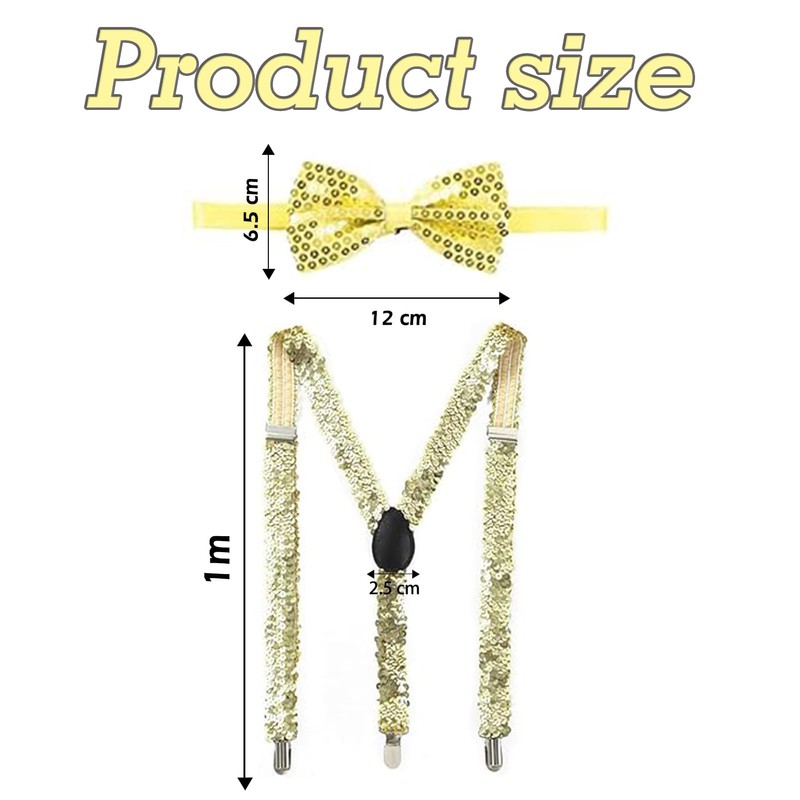 - Sequin suspenders set: includes elastic glitter sequin suspenders and matching sequin bow tie adjustable, easy to wear