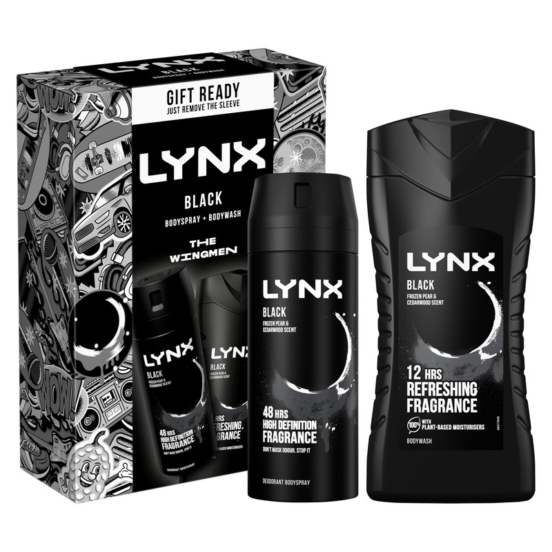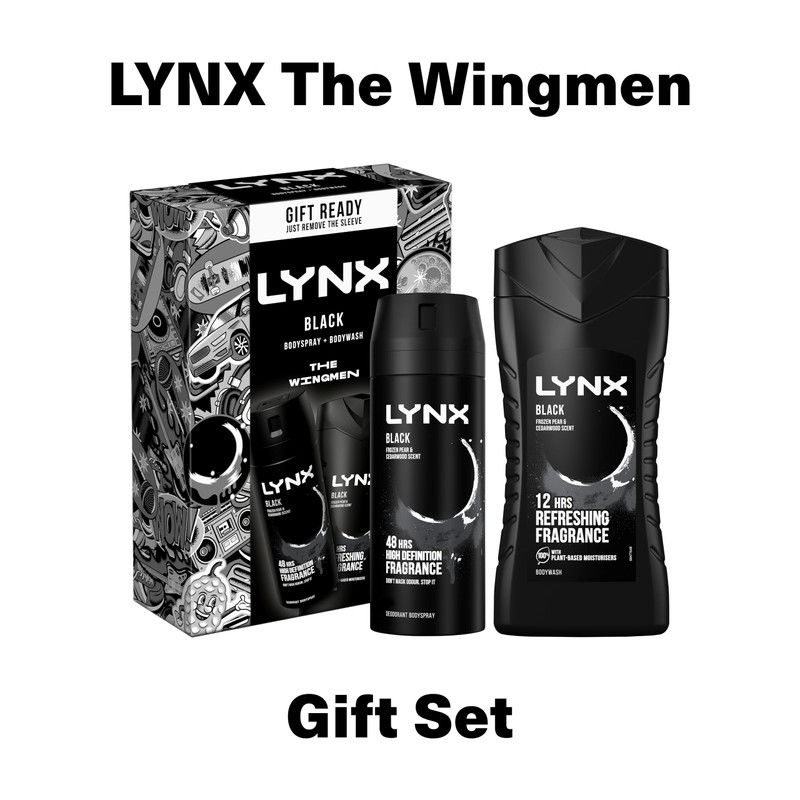 Product DescriptionSo, it's gift-giving time again. The age-old question, 'What will I get him?' Relax. The answer's simple. The legendary LYNX Black The Wingmen Duo Gift Set, the go-to for gift givers everywhere, guaranteed to please, year after great-smelling year. Whoever he is, whatever the occasion, it's the gift that always feels fresh. Teaming full-size LYNX Black Body Wash and Deodorant Body Spray together, this set of gifts for him will up his fragrance game with a refreshing frozen pear and cedarwood scent that doesn't need to shout to make its voice heard. The shower gel kicks odour to the kerb, leaving him in control and confident with 12 hours of freshness. Plus, it contains 100% plant-based moisturisers for naturally soft and silky skin. The men's deodorant features our revolutionary dual-action technology that fights odour-causing bacteria to help him bust odour and smell iconic for 48 hours. Packaged and ready to gift in a box, these gifts for him will help him stay at the top of his game and have the confidence to be the best version of the only thing he can be: himself. Son, brother, husband, dad, uncle, cousin… whoever you're buying for, there'll be no fake smiles or eye rolling when he opens this one because he'll actually like it. And use it. And every time he does, he'll remember the great gift you gave him. Probably. The point is, we know guys want to smell good and that's why our gift sets always hit the spot.IngredientsLYNX BODYSPRAY BLACK 150ML Ingredients: Alcohol Denat., Butane, Isobutane, Propane, Parfum, Zinc Neodecanoate, Isopropyl Myristate, Alpha-Isomethyl Ionone, Benzyl Benzoate, Citral, Citronellol, Geraniol, Limonene, Linalool. LYNX BODYWASH BLACK 225ML Ingredients: Aqua, Sodium Laureth Sulfate, Glycerin, Sodium Chloride, Cocamidopropyl Betaine, Parfum, Sodium Benzoate, Citric Acid, Lactic Acid, Disodium EDTA, PPG-6, Saccharide Isomerate, Alpha-Isomethyl Ionone, Limonene, Linalool, CI 19140, CI 42090DirectionsApply body wash to wet skin, lather, and rinse off. Spray body spray evenly on body.