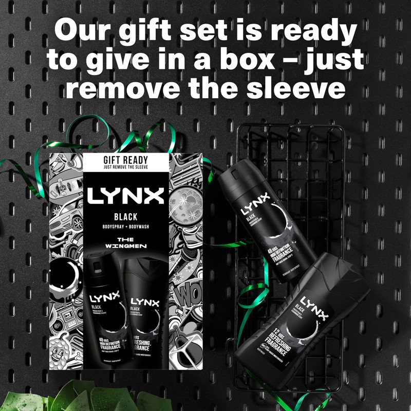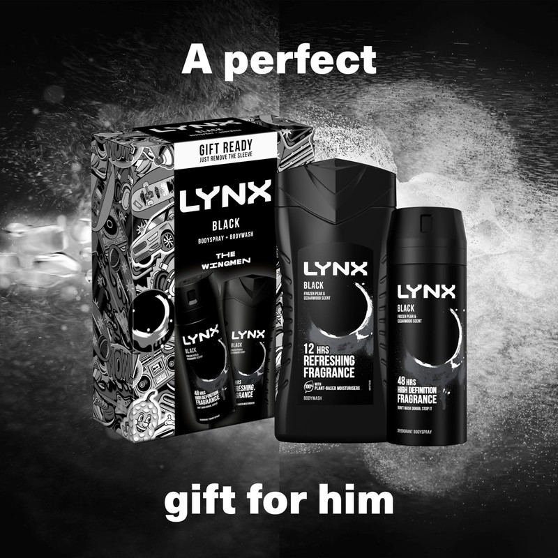 - LYNX Black The Wingmen Duo Gift Set includes two gifts for him: LYNX Black Body Wash 225 ml and Deodorant Body Spray 150 ml