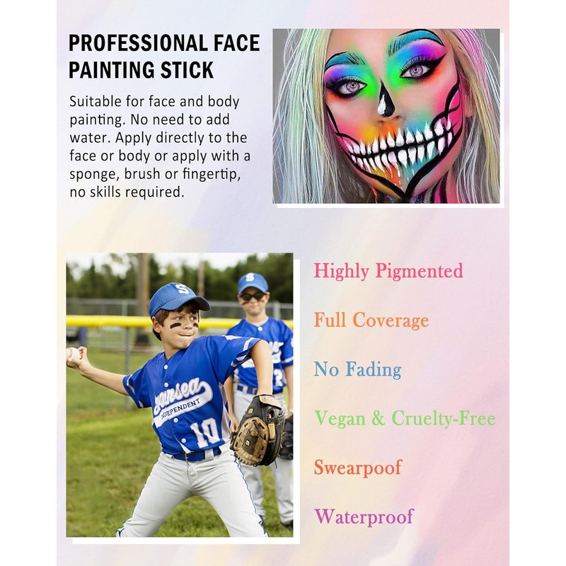 Professional Face & Body Paint Stick – Highly pigmented, waterproof, and long-lasting for flawless coverage. Perfect for sports, cosplay, Halloween, and stage makeup. Easy to apply, blend, and remove. Made with safe, skin-friendly ingredients.