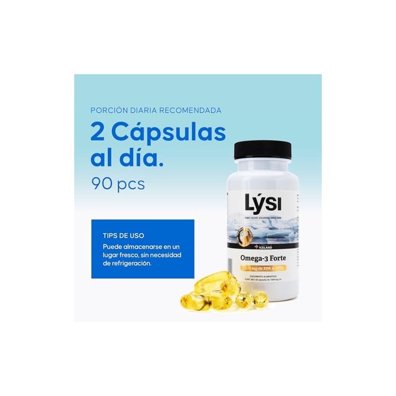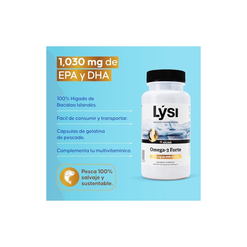 Lysi Omega-3 Forte 90 Capsulas, 1030 mg de EPA DHA, Aceite de Pescado 100 Salvaje y Sustentable, Importadas de Islandia.