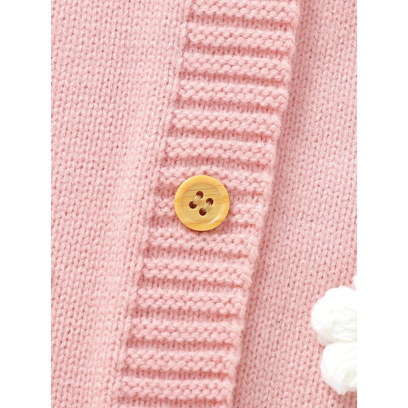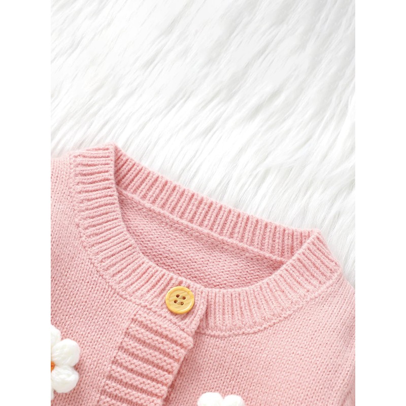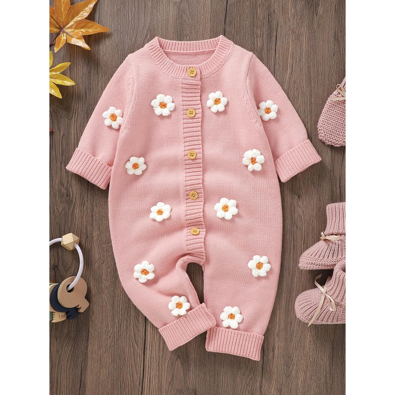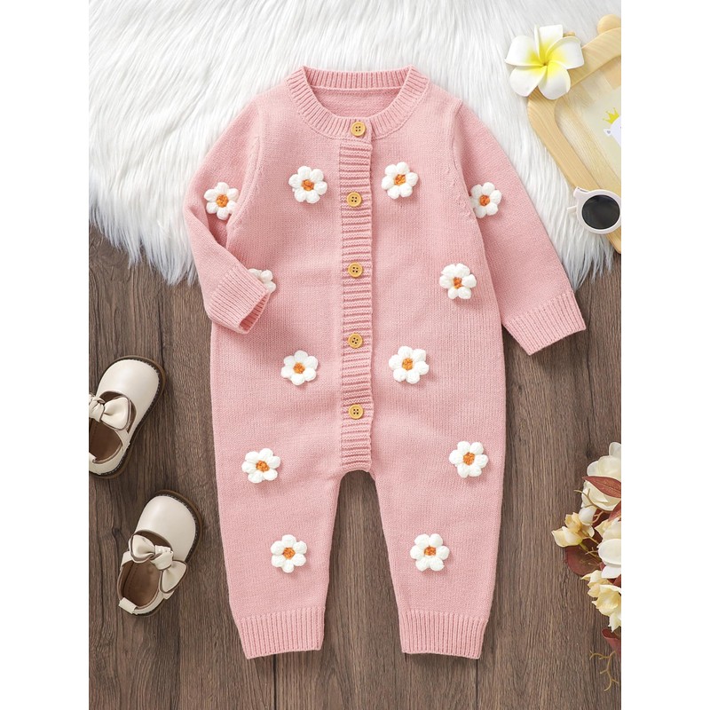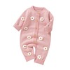 Baby Girls Knit Romper, Long Sleeve Crew Neck Button Closure Flower Fall Jumpsuit Sweater
